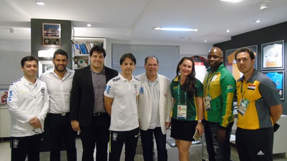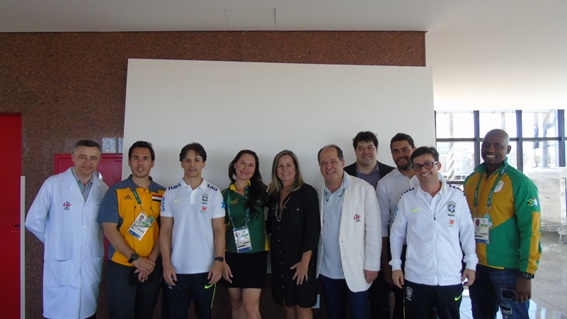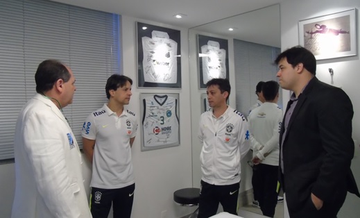 Dr. Paulo Lobo em conversa com os fisioterapeutas da seleção brasileira e o médico do doping.